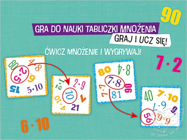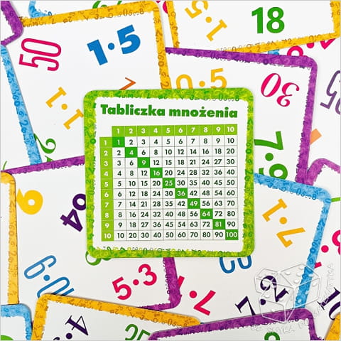 Na kartach znajdują się kolorowe zapisy działań mnożenia oraz ich iloczynów. Karty zostały podzielone na trzy poziomy trudności: mnożenie przez 1–5 i 10; mnożenie przez 6–9 oraz najtrudniejszy wariant: mnożenie w zakresie 1–10. Dodatkowe karty z tabliczką mnożenia 1–10 pomogą w szybkiej powtórce i utrwaleniu zdobytej wiedzy.