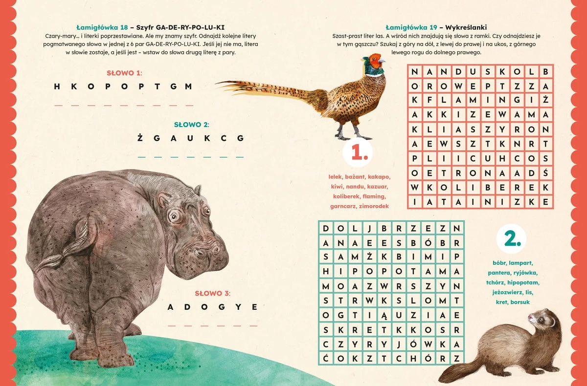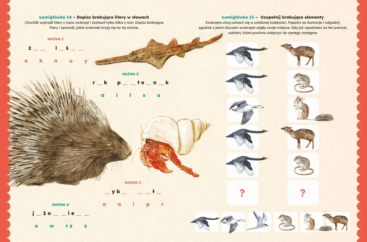 Intryguje cię świat przyrody i lubisz zagadki i łamigłówki? To świetnie, w takim razie ta książeczka jest idealna dla ciebie. Znajdziesz w niej fascynujące fakty o zwierzętach, krzyżówki, szyfry, testy ABC, gry słowne i wiele łamigłówek logicznych. Pomóż dotrzeć ptakom do gniazd w labiryntach, znajdź wszystkie zwierzęta ukryte w wykreślankach, odpowiedz na pytania i rozszyfruj zakodowane wiadomości.