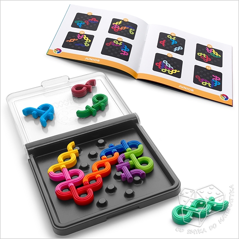 plansza z przezroczystą pokrywką, 11 elementów układanki, instrukcja, książeczka z zadaniami (120 łamigłówek, 5 poziomów trudności) i ich rozwiązaniami