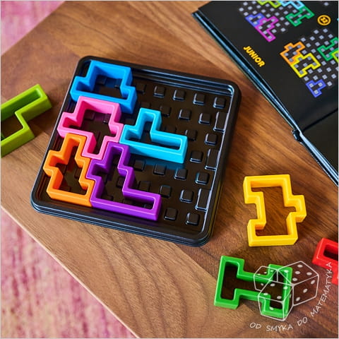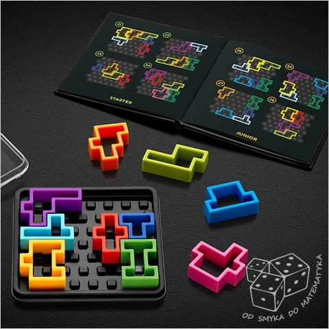 kwadratowa plansza z pokrywką, 10 kolorowych elementów, książeczka ze 120 zadaniami i ich rozwiązaniami, instrukcja z zasadami gry