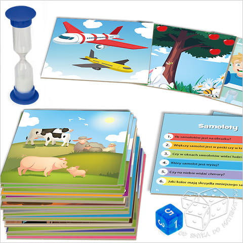 55 kart tematycznych, klepsydra, kostka, karta z zasadami gry