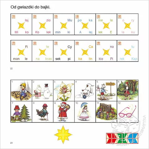 Książeczka Od gwiazdki do bajki 2. Nauka czytania sylabami jest uzupełnieniem i kontynuacją poprzedniej części. Broszura stanowi wartościową pomoc dla dzieci w pierwszym etapie nauki czytania i pisania. Dziecko, już w początkowym okresie usprawniania słuchu fonematycznego, w naturalny sposób wyróżnia sylaby w wyrazie i w późniejszym okresie nauki powinno właśnie sylabami odczytywać wyrazy. Sylabizowanie przy czytaniu prowadzi bowiem do płynności i dzięki syntetycznemu postrzeganiu układu liter tworzących sylabę eliminuje głoskowanie. Wypowiadanie sylab zmniejsza również prawdopodobieństwo popełniania błędów w czasie czytania. Przedstawiona w książeczce metoda doskonalenia umiejętności czytania i pisania opiera się na zabawowych formach ćwiczeń językowych, w których ważną rolę odgrywa właściwie dobrana szata graficzna.