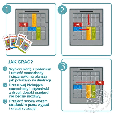To wersja dla przedszkolaków gry Rush Hour – prawdziwej perełki wśród łamigłówek logicznych. Jesteś dowódcą drużyny strażackiej, którego samochód utknął na zatłoczonym parkingu. Gra zapewnia wspaniałą rozrywkę oraz rozwija umiejętność sekwencyjnego myślenia.